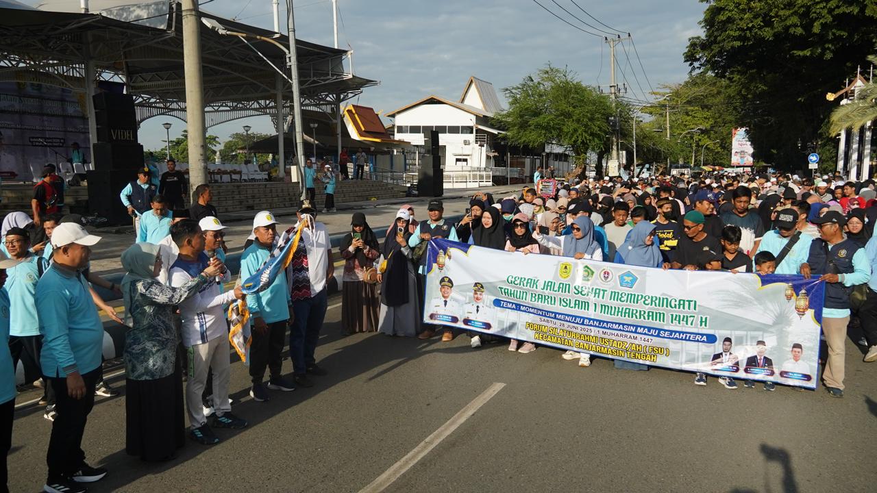 terasbanua.my.id, Banjarmasin– Ribuan warga Kota Banjarmasin memadati kawasan Siring Balai Kota pada Sabtu pagi (28/6), dalam rangkaian kegiatan jalan sehat memperingati Tahun Baru Islam 1 Muharam 1447 Hijriah.